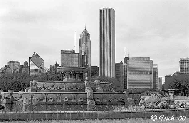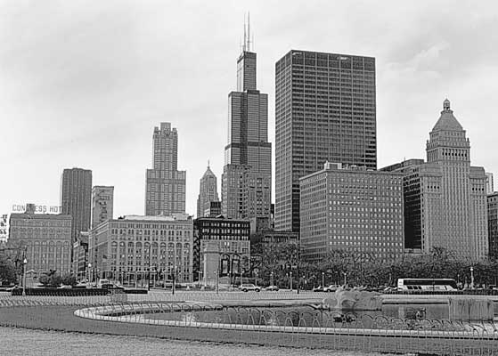 Two Chicago landmarks: the Sears Tower, with Buckingham Fountain in the foreground. The Fountain was turned off for the season (11-05-00).